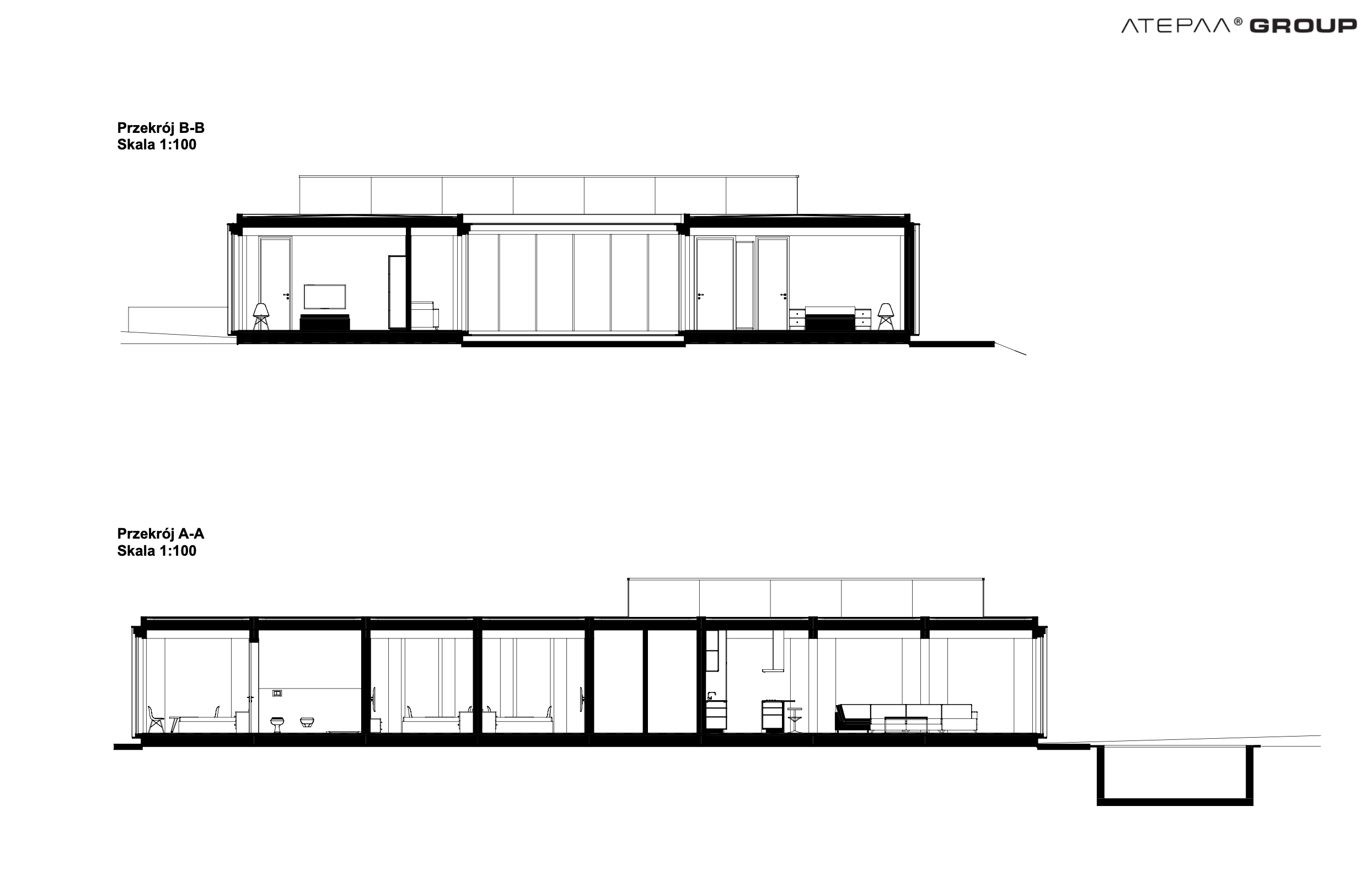 Dom powstał w systemie modułowym belkowo-słupowym, co umożliwia niemal nieograniczoną konfigurację i personalizację projektu, dostosowaną do wymagań najbardziej wymagających klientów. Przestronne wnętrza wyróżniają się otwartym układem, a zastosowanie przeszkleń na niemal całej powierzchni fasad pozwala na maksymalne doświetlenie oraz wyjątkowy kontakt z otaczającą przyrodą.