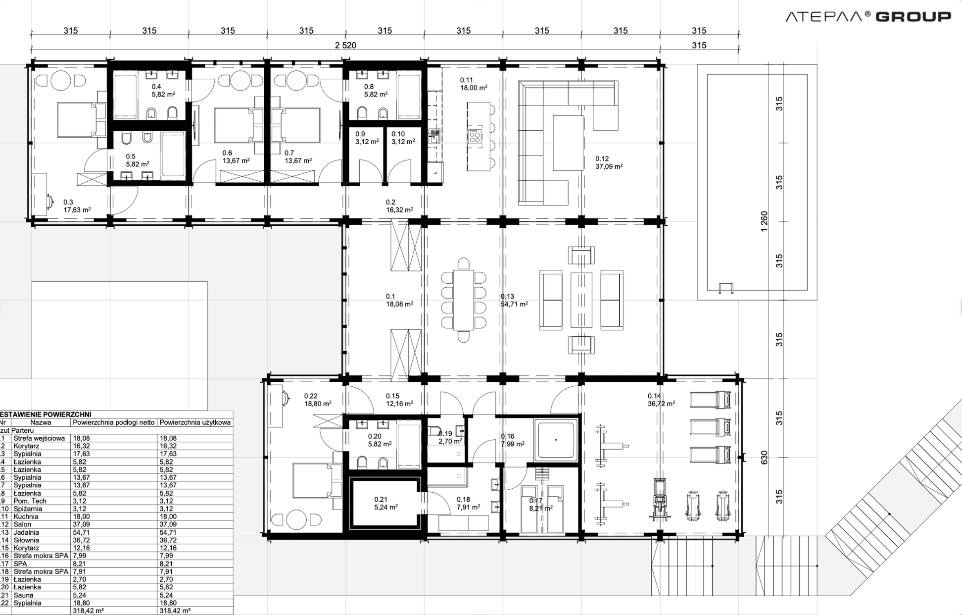 • Szerokość i długość: Modułowa konstrukcja pozwala na dowolne dopasowanie szerokości i długości w zależności od działki oraz preferencji klienta.